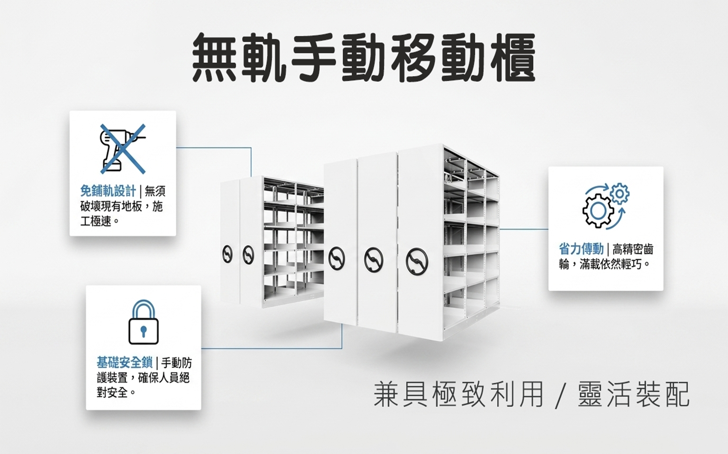 • 基礎安全鎖: 配備手動鎖定裝置,防止存取時櫃體意外滑動。